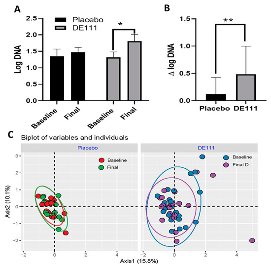Levels of B. subtilis DNA detected in fecal samples collected pre- and post-intervention (A) and the change in logDNA from baseline between the two intervention groups (B) indicate that DE111 consumption increases B. subtilis in the GI tract. However, four weeks of DE111 consumption did not significantly alter the composition and structure of the gut microbiota (C). Error bars represent ±SEM. * indicates p-values <0.05 and ** indicate p-values <0.01. Ellipses in the PCoA represent the 95% CI.