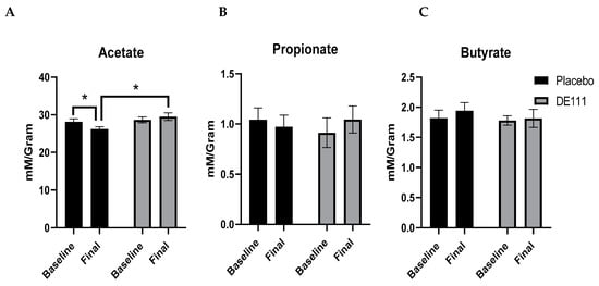 The major microbially-produced short chain fatty acids (SCFA), acetate (A), propionate (B), and butyrate (C) quantified in feces at baseline and post-intervention. Error bars represent ±SEM, *denotes p < 0.05.