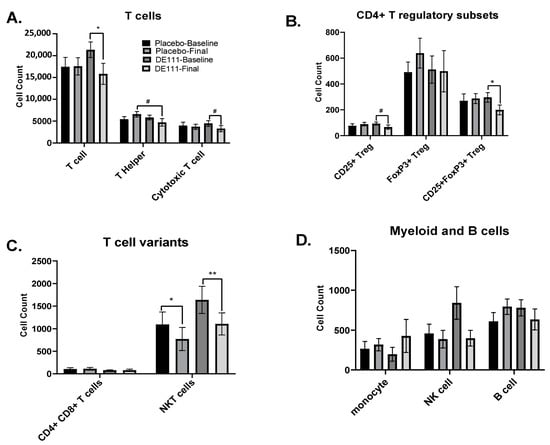 Basal immune status at baseline and post-intervention in Placebo and DE111 groups: Total CD3+ T cell populations (A), CD4+ T regulatory subpopulations (B), T cell variants (C), and myeloid and B cells (D). Error bars represent ± SEM. * denotes p < 0.05, **denotes p < 0.01, and # denotes a p-value between 0.05–0.08.