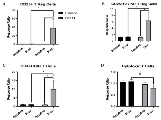 In order to better understand how DE111 intervention impacted immune cell responses, we stimulated cultured PBMCs with bacterial lipopolysaccharide (LPS). The immune cell response was calculated as a ratio of LPS-stimulated cell counts/basal cell counts. In general, most of the cell counts were not significantly altered with LPS-stimulation (i.e., response ratio of ~1; data not shown). However, CD25+ and CD25+FoxP3+ T regulatory cell counts were significantly increased in the DE111 group, both from baseline levels and at the final timepoint between the two groups (Figure 6A,B; Table 3). Similarly, DE111 intervention led to a significant increase in CD4+CD8+ double-positive T cells both within and between groups (Figure 6C; Table 3). In contrast, CD8+ cytotoxic T cells were reduced after DE111 intervention compared to the placebo group (Figure 6D, Table 3). There were no significant differences in the percent proliferating cells after LPS stimulation (Supplemental Figure S2).