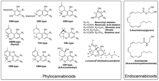 To date, over 100 phytocannabinoids have been identified in C. sativa [,]. These compounds are separated into various classes based on their structures: cannabigerol (CBG)-type, cannabichromene (CBC)-type, cannabidiol (CBD)-type, thymyl-type, THC-type, cannabicyclol (CBL)-type, cannabielsoin (CBE)-type, cannabinol (CBN)-type, and 8,9-sconmenthyl-type [], among which only the THC type has been known to possess the psychoactive property (Figure 1). In C. sativa, all phytocannabinoids have an alkyl side chain attached to the central resorcinyl core. Phytocannabinoids are primarily synthesized and stored within glandular trichomes that are present on the female flowers and to a lower degree on the leaves []. These trichomes contain resin storage cells where cannabinoids and terpenes build up to form a resin that is postulated to act as an antiherbivory agent. As the flower and seeds mature, the composition of cannabinoids and terpenes within the resin changes, with the highest phytocannabinoid content found at flower maturity []. Phytocannabinoids are not transported to seeds, with only minute quantities (< 5ppm) found in hemp seed oil [].