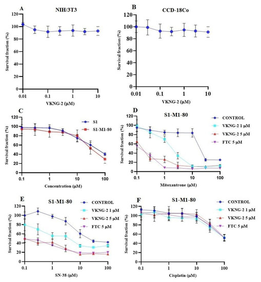 The effect of VKNG-2 in transformed mouse fibroblast (NIH/3T3) and human colon fibroblast (CCD-18Co) cell lines (A,B). The effect of VKNG-2 in S1 parental and ABCG2-overexpressing S1-M1-80 colon cancer cells (C). The survival fraction (%) was determined following incubation with 5 µM of VKNG-2 for 72 h in S1 (blue) and S1-M1-80 (red) cell lines and IC50 values of mitoxantrone (D), SN-38 (E), and cisplatin (F) in parental S1 and drug-selected ABCG2 overexpressing S1-M1-80 colon cancer cells with or without VKNG-2. The points with error bars represent the mean ± SD of independent determinations in triplicate. The figures are representative of three independent experiments.