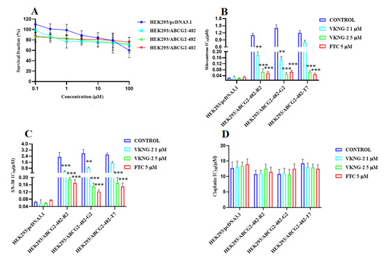 The effect of VKNG-2 in HEK293 cells transfected the gene coding for the ABCG2 transporter. (A) The survival fraction (%) for HEK293/pcDNA3.1 (empty DNA vector control), HEK293/ABCG2-482-R2, HEK293/ABCG2-482-G2, and HEK293/ABCG2-482-T7 cell lines was determined following incubation with 5 µM of VKNG-2 for 72 h. The IC50 values for mitoxantrone following incubation with VKNG-2 (1 or 5 µM) or FTC (5 µM) for 72 h in HEK293/pcDNA3.1 (empty DNA vector control), HEK293/ABCG2-482-R2 (HEK293/ABCG2-482-G2 and HEK293/ABCG2-482-T7 cell lines. The IC50 values of mitoxantrone (B), SN-38 (C), and cisplatin (D) in HEK293/pcDNA3.1 (empty DNA vector control), HEK293/ABCG2-482-R2, HEK293/ABCG2-482-G2, and HEK293/ABCG2-482-T7 cell lines. The points with error bars represent the mean ± SD of independent determinations in triplicate. The figures are representative of three independent experiments. ** p ≤ 0.01 and *** p < 0.001 compared to the control group.