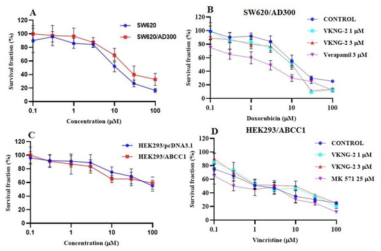 The effect of VKNG-2 in SW620 parental, ABCB1-overexpressing SW620/Ad300 colon cancer cells and HEK293/pcDNA3.1 parental and HEK293/ABCC1 transfected cells. (A) The survival fraction (%) for the SW620 parental and SW620/Ad300 colon cancer cell lines were determined following incubation with VKNG-2 for 72 h. (B) The IC50 values of doxorubicin in the presence of vehicle (Control), VKNG-2 (1 or 3 μM) or verapamil (3 μM) for 72 h in SW620 parental and SW620/Ad300 colon cancer cells. (C): The survival fraction (%) for the HEK293/pcDNA3.1 (empty DNA vector control) and HEK293/ABCC1 (transfected with the DNA coding for the ABCC1 transporter) cells were determined following incubation with VKNG-2 for 72 h. (D) The IC50 values of vincristine in the presence of vehicle (Control), VKNG-2 (1 or 3 μM) or MK-571 (25 μM) for 72 h in HEK293/pcDNA3.1 and HEK293/ABCC1 cells. The points with error bars represent the mean ± SD of independent determinations in triplicate. The figures are representative of three independent experiments.