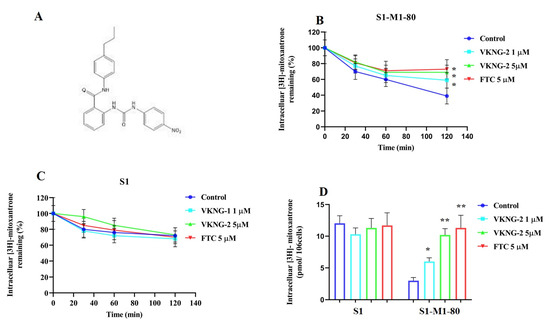 The intracellular accumulation of [3H]-mitoxantrone and the efflux activity of the ABCG2 transporter (at 0, 30, 60 and 120 min) in S1 parental and S1-M1-80 resistant cancer cells was determined in the presence or absence of 1 and 5 µM of VKNG-2 or 5 µM of FTC, as previously described [7]. Briefly, the cells were trypsinized and incubated in DMEM with or without the reversal compounds (VKNG-2 at 1 and 5 µM and FTC at 5 µM) at 37 °C for 2 h. Subsequently, the cells were incubated with 0.01 µM of [3H]-mitoxantrone with or without the inhibitor at 37 °C for an additional 2 h. The radioactivity was quantified using a scintillation counter.