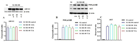 The expression of the ABCG2, PI3K - p110β and AKT proteins was determined using Western blotting as previously described [70]. Briefly, the cell lysates were prepared from the parental S1 and drug-resistant S1-M1-80 cells after incubating with 5 µM of VKNG-2 for 24, 48 and 72 h. After protein quantitation using the BCA Protein Assay Kit (Thermo Scientific, Rockford, IL, USA), the protein samples were separated by PAGE and then transferred onto PVDF membranes. After blocking the membranes with 5% milk, the membranes were incubated with primary antibodies against ABCG2/PI3k p110β/AKT or β actin (1:1000) at 4 °C overnight, which was followed by further incubation with HRP-linked secondary antibody (1:1000) for 2 h at room temperature. The protein bands were visualized after exposed the membranes to Pierce™ ECL Western blotting substrate (Thermo Scientific, Rockford, IL, USA). The expression levels of the proteins were analyzed by ImageJ software.