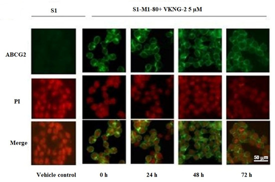 The effect of VKNG-2 on the expression and localization of ABCG2 using immunofluorescence. The effect of the incubation of S1 and S1-M1-80 colon cancer cells with vehicle (Control) or 5 µM of VKNG-2 for incubated for 0, 24, 48 or 72 h. The green color represents the presence of the ABCG2 transporter, and the red color represents the nucleus.