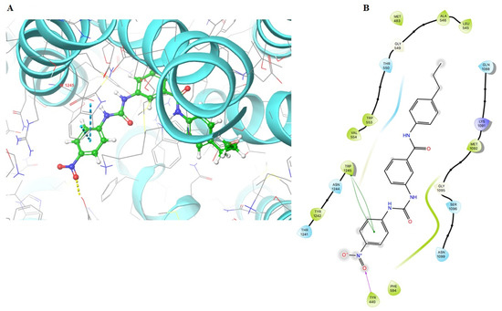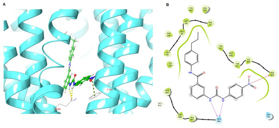 As VKNG-2 inhibited the efflux function of the ABCG2 transporter, we conducted a docking simulation with mitoxantrone (an ABCG2 substrate) at the binding site (6VXI) of the ABCG2 transporter. Our results indicated that VKNG-2 docked into the substrate-binding site, with a docking score of −10.2 kcal/mol, which is shown in Figure 8. The binding of VKNG-2 to the ABCG2 protein was primarily due to hydrophobic interactions. VKNG-2 is located and stabilized in the hydrophobic cavity formed by Phe431, Phe432, Phe439, Val442, Val546, Met549 in chain A and Phe432, Phe439, Val546, Met 549 in chain B. Furthermore, the binding of VKNG-2 was stabilized by a hydrogen bond formed with Asn436 in chain A and a π-π stacking with Phe439 in chain B. Based on the docking images, π-π interactions were formed between the phenyl of the Phe439 and phenyl group adjacent to the alkyl chain of VKNG-2 and a hydrogen bond interaction between the carbonyl group of the urea in VKNG-2 and the amino hydrogen of Asn436. In the 6QEX structure (ABCB1), a hydrogen bond was formed between the carbonyl of the side chain of Gln 990 and the nitrogen of VKNG-2 and there was a π-bond interaction between the phenyl side chain of Phe 303 and the nitro group of VKNG-2 (Figure 9). The docking score of VKNG-2 for the ABCB1 transporter was −6.660 kcal/mol (Figure 9).
