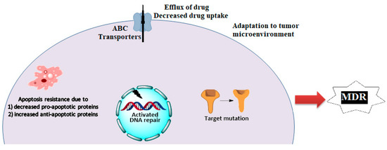 Cancer chemotherapy has made significant advances in decreasing the mortality and improving the quality of life for cancer patients [1,2,3]. Nonetheless, cancer is the second leading cause of death and globally, causing an estimated 9.6 million deaths in 2018 [4]. Despite the availability of numerous chemotherapeutic drugs, the 5-year survival rates for many cancers are low due to resistance to these drugs produced by innate or acquired mechanisms [5,6,7,8,9]. Multidrug resistance (MDR) is among the primary causes for the failure of anticancer efficacy and the high mortality rates in metastatic cancer patients [2,7,10,11]. MDR can be defined as the acquisition of resistance to numerous structurally unrelated antineoplastic drugs in cancer cells or tumors [10,11,12]. The various factors that mediate MDR are shown in Scheme 1.