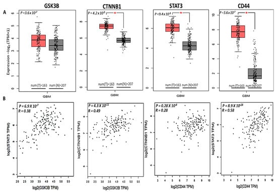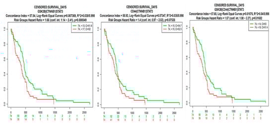 2.5. Increased Expressions of the GSK3β/β-Catenin/STAT3/CD44 Signatures and Reduced miR-135b Are Associated with Poor Prognoses of GBM Patients