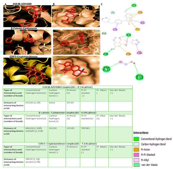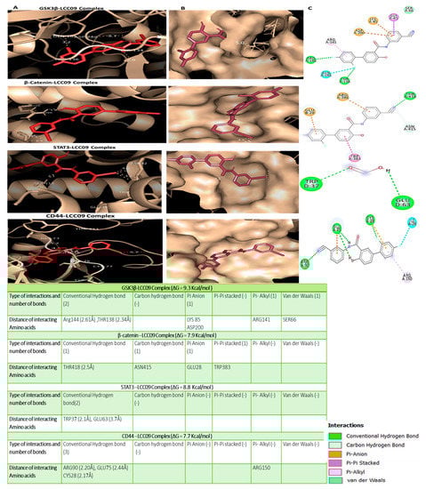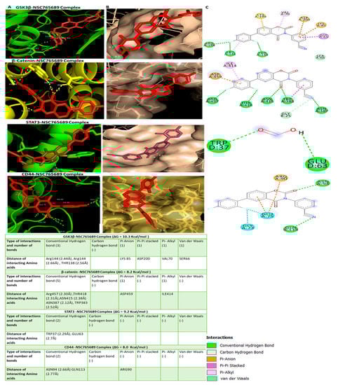 2.6. In Silico Molecular Docking Showed Putative Binding of NSC765689 with GSK3β/β-Catenin/STAT3/CD44