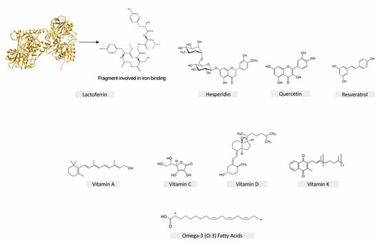 Lactoferrin (fragment involved in iron binding shown in Figure 1) is a basic glycoprotein; it belongs to the transferrin family and comprises 692 amino acids. Lactoferrin is found in breast and bovine milk, and is particularly concentrated in colostrum, the first milk produced in the days immediately following birth. Lactoferrin is a glycoprotein capable of subtracting unbound iron from body fluids and areas of inflammation with twice the capacity of transferrin to avoid the damage produced by toxic oxygen radicals and decrease the availability of ions ferric for the microorganisms that invade the host []. Lactoferrin has antibacterial, antiviral, antioxidant, and immunomodulatory functions. As for viral infections, lactoferrin appears to inhibit the attack of viruses on their receptors on human cells []. The potential spectrum of activity of lactoferrin against SARS-CoV-2 comes from observations on SARS-CoV []. It has been shown that lactoferrin has antiviral properties mainly through three mechanisms: direct binding to the virus; binding of lactoferrin with heparan sulfate proteoglycans (HSPGs), which are the adhesion molecules of many viruses on the surface of the host cell, thus acting with a competitive mechanism; and intracellular inhibition of viral replication [,,]. It is also able to enhance the antiviral action of T and NK 20 lymphocytes []. Based on these observations, a clinical study was proposed for paucisymptomatic and asymptomatic COVID-19 patients to evaluate the efficacy and safety of an innovative liposomal formulation of lactoferrin administered for oral and intranasal use [].