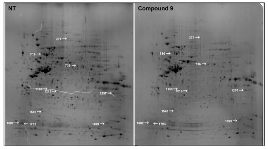 Two-dimensional gel images of AGS cells treated with or without compound 9. Total protein extracts were separated on pH 3.0–10.0 nonlinear IPG strips in the first dimension followed by 12% SDS-PAGE in the second dimension and visualized by CBB staining. Ten protein spots that were downregulated more than 3-fold by compound 9 (400 μM) treatment were identified using MALDI-TOF MS analysis. The selected spots are marked with white arrows.