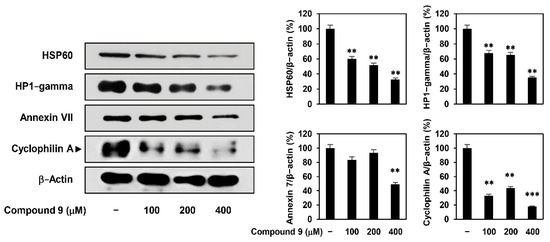Validation of the identified protein spots. AGS cells were treated with compound 9 (100–400 μM) for 24 h. Protein levels were detected by western blot analysis and further quantified by densitometry. The level of β-actin was used as an internal control. ** p < 0.01, *** p < 0.001 vs. the control.