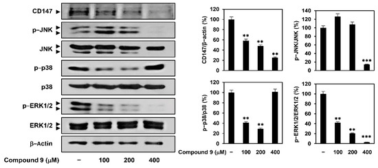 CypA is a member of the immunophilin family with peptidyl prolyl cis-trans isomerase activity and plays important roles in protein folding, trafficking, assembly, immune-modulation, and cell signaling [17,18]. Several studies have demonstrated the overexpression of CypA and its cellular receptor CD147 in many malignant tumors including GC [19,20]. Binding of CypA to CD147 activates the mitogen-activated protein kinase (MAPK) signaling pathway, which contributes to cancer cell proliferation and migration [21]. To determine whether CypA is a key molecular target of compound 9 in GC cells, we investigated the effect of compound 9 on CD147 expression and MAPK signaling in AGS cells. Treatment with compound 9 inhibited the expression of CD147 in a dose-dependent manner (Figure 3). In addition, compound 9 suppressed the phosphorylation of c-Jun N-terminal kinase (JNK) and extracellular signal regulated protein kinase 1/2 (ERK1/2) without affecting the total protein levels. However, p38 MAPK phosphorylation showed a biphasic response based on the concentration of compound 9. These results suggest that compound 9 may downregulate CD147-mediated MAPK signaling pathway, including JNK and ERK1/2, by inhibiting the expression of CypA and CD147.