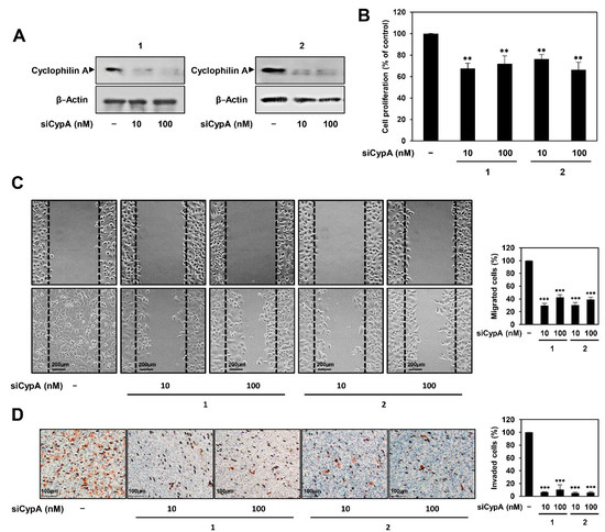 Effect of CypA knockdown on the proliferation, migration, and invasion of AGS cells. AGS cells were transfected with two types of CypA siRNAs (10 and 100 nM). (A) Knockdown of CypA gene was confirmed by western blot analysis. (B–D) Effect of CypA knockdown on the (B) proliferation, (C) migration, and (D) invasion of AGS cells. ** p < 0.01, *** p < 0.001 vs. the control.