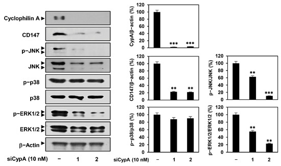 Next, we investigated whether CypA knockdown affected CD147 expression and its downstream MAPK signaling in AGS cells. As shown in Figure 5, CD147 expression was markedly reduced by siCypA 1 and 2. Moreover, the phosphorylation of JNK and ERK1/2 was suppressed by CypA knockdown, whereas that of p38 MAPK was not. These data indicate that CypA silencing leads to the downregulation of the CD147-mediated MAPK signaling pathway in AGS cells, similar to compound 9 treatment.