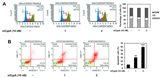 Effect of CypA knockdown on the cell cycle progression and apoptosis of AGS cells. AGS cells were transfected with CypA siRNAs (10 nM) and incubated for 72 h. (A) The cell cycle distribution and (B) apoptotic cell death were analyzed using a Muse cell analyzer and Muse analysis software. ** p < 0.01, *** p < 0.001 vs. the control.