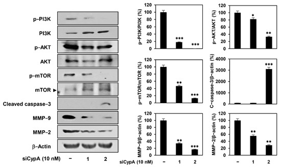 Next, we evaluated the effect of CypA knockdown on the PI3K/AKT/mTOR pathway in AGS cells. As shown in Figure 7, CypA knockdown inhibited the phosphorylation of PI3K, AKT, and mTOR without significantly affecting the total protein levels. Furthermore, CypA knockdown activated caspase-3, a critical executioner of apoptosis, and suppressed the expression of matrix metalloproteinase (MMP)-9 and MMP-2 that play an important role in tumor invasion and metastasis, consistent with the effect of compound 9 treatment in our previous study (Figure 7). Taken together, our results suggest that the anticancer activity of compound 9 against AGS cells is closely related to the downregulation of CypA function.