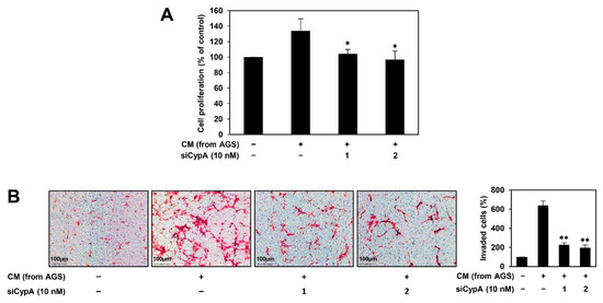 Effect of CypA knockdown on the AGS cell-induced angiogenesis of HUVECs. AGS cells were transfected with CypA siRNAs (10 nM) and incubated for 24 h. CM was obtained from the transfected cells and used for the (A) proliferation and (B) invasion of HUVECs. * p < 0.05, ** p < 0.01 vs. the control.