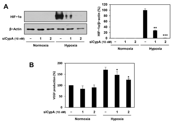 Effect of CypA knockdown on the HIF-1α and VEGF expression in AGS cells. AGS cells were transfected with CypA siRNAs (10 nM) and incubated for 24 h. The cells were incubated for 8 h under either normoxic or hypoxic conditions. (A) HIF-1α protein levels were detected by western blot analysis and further quantified by densitometry. The level of β-actin was used as an internal control. (B) The concentration of VEGF protein in the supernatant was determined by a VEGF ELISA. * p < 0.05, ** p < 0.01, *** p < 0.001 vs. the hypoxic control.