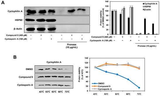Cells were collected and lysed using RIPA buffer (ATTO). Protein samples (99 µL, 2 mg/mL) were incubated with 1 µL of DMSO, compound 9 (400 µM), or cyclosporin A (100 µM) in the dark at 4 °C for 1 h. The samples were heated at different temperatures for 5 min in a heat block (Benchmark Scientific, NJ, USA), followed by cooling for 5 min at room temperature. The heated samples were centrifuged at 20,000× g for 20 min at 4 °C, and the supernatants were mixed with 6xSDS sample buffer and analyzed by SDS-PAGE and western blotting.