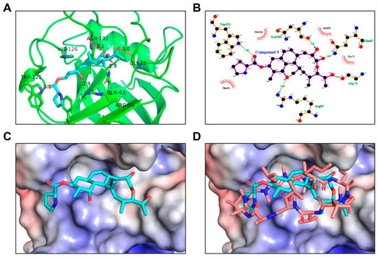 To further elucidate the binding of compound 9 to CypA at the molecular level, we simulated a binding model of CypA with compound 9 based on the crystal structure of a complex between CypA and cyclosporin A (protein data bank ID: 1CWA) and AutoDock Vina 1.1.2 programs [29]. Docking modeling revealed that compound 9 binds to CypA via hydrogen bonding interactions with Arg55, Gln63, Asn102, Gly72, and Trp121 residues and hydrophobic interactions with Phe60, Ala101, Thr73, and His126 residues of CypA (Figure 11A,B). In addition, the macrolide moiety of compound 9 snugly fits the hydrophobic pocket of CypA, and its pyrrolidine group is involved in a π-π interaction with the aromatic residue of Phe60 in CypA. By analyzing the results of the docking studies, we found that compound 9 structurally overlapped with cyclosporin A in the CypA docking model (Figure 11C,D).