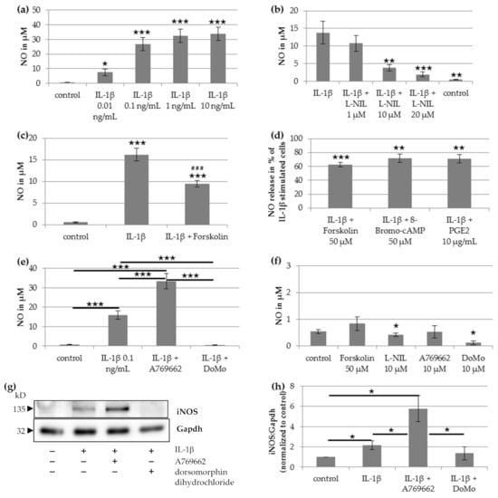 Impact of IL-1β on nitric oxide (NO) release and NO synthase (iNOS) expression of human chondrocytes. (a) NO release after stimulation with Interleukin (IL)-1β at different concentrations. Statistical differences vs. unstimulated cells, repeated-measures ANOVA (n = 7). (b) NO release after stimulation with IL-1β (0.1 ng/mL) and L-NIL at different concentrations. Statistical differences vs. IL-1β-stimulated cells, repeated-measures ANOVA (n = 7). (c) NO release after stimulation with 0.1 ng/mL IL-1β and 50 µM forskolin. Statistical differences *** vs. unstimulated cells or ### vs. IL-1β-stimulated cells, Wilcoxon signed-rank test and Bonferroni adjustment (n = 22). (d) NO release after simultaneous stimulation of 0.1 ng/mL IL-1β with 50 µM forskolin (n = 22), 50 µM 8-Bromo-cAMP (n = 10), or 10 µg/mL PGE2 (n = 9) normalized to IL-1β-stimulated cells. Statistical differences vs. IL-1β-stimulated cells, Wilcoxon signed-rank test. (e) Impact of activation or inhibition of AMPK on IL-1β-induced NO release. Statistic: Repeated-measures ANOVA with Post Hoc test and Bonferroni adjustment (n = 9). (f) NO release after stimulation with 50 µM forskolin, 10 µM L-NIL, 10 µM A769662, or 10 µM dorsomorphin dihydrochloride (DoMo). Statistical differences vs. unstimulated cells, Wilcoxon signed-rank test (n = 5). (g) Representative Western blot of iNOS expression after stimulation with/without 0.1 ng/mL IL-1β, 50 µM forskolin, 10 µM A769662 and 10 µM dorsomorphin dihydrochloride. (h) Densitometric quantification of iNOS/Gapdh expression after stimulation with 0.1 ng/mL IL-1β, 10 µM A769662 or 10 µM dorsomorphin dihydrochloride normalized to unstimulated cells (n = 6). Statistic: Wilcoxon signed-rank test. Values are reported as mean or percentage ± SD. *** p < 0.005, ** p < 0.01 and * p < 0.05. DoMo: Dorsomorphin dihydrochloride.