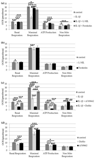 Impact of IL-1β on mitochondrial respiration in chondrocytes. (a) Impact of 50 µM forskolin and 10 µM L-NIL (iNOS inhibition) on IL-1β (0.1 ng/mL)-induced mitochondrial dysfunction; n = 14. (b) Control experiments on the impact of 50 µM forskolin (n = 11) and 10 µM L-NIL (n = 13) on mitochondrial function. (c) Impact of activation or inhibition of AMPK on IL-1β-induced mitochondrial dysfunction (n = 12). (d) Control experiments on the impact of 10 µM A769662 and 10 µM dorsomorphin dihydrochloride on mitochondrial function (n = 12). Statistic: Wilcoxon signed-rang test and Bonferroni adjustment. Values are reported as mean ± SD. *** p < 0.005, ** p < 0.01 and * p < 0.05. OCR: Oxygen consumption rate, DoMo: Dorsomorphin dihydrochloride.