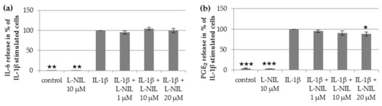 Co-application of 0.1 ng/mL IL-1β and 10 µM L-NIL, an inhibitor of iNOS, resulted in a significant reduction of IL-1β-induced NO release (Figure 1b, p = 0.006), showing that L-NIL is a useful compound to investigate NO-related effects.