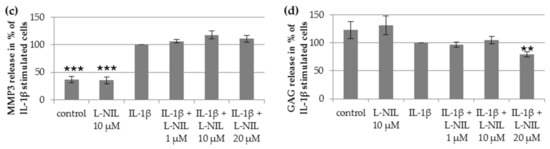 Impact of L-NIL on the IL-1β-induced release of (a) IL-6 (n = 6), (b) PGE2 (n = 5), (c) MMP3 (n = 7), and (d) the production of GAG (n = 6). Values are reported as percentage ± SD normalized to IL-1β-stimulated cells. Statistical differences vs. IL-1β-stimulated cells, repeated-measures ANOVA with Post Hoc test; *** p < 0.005, ** p < 0.01 and * p < 0.05.