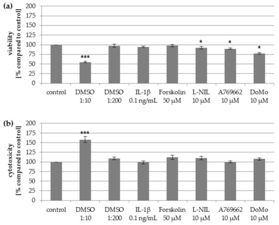 To control whether the observed effects were based on cytotoxic effects of the mediators used, an assay was performed to determine the percentage of living and dead chondrocytes after stimulation with different mediators. The percentage of dead cells did not change significantly after stimulation with IL-1β, forskolin, L-NIL, A769662, or dorsomorphin dihydrochloride (Figure 4). After stimulation with IL-1β and forskolin, the viability of chondrocytes was similar to the unstimulated control. L-NIL, A769662, and dorsomorphin dihydrochloride reduced the percentage of living cells slightly, but the observed effect of these mediators on NO release and mitochondrial function cannot be explained by these small effects on the viability. The cytotoxic dimethyl sulfoxide (DMSO) control (1:10) proved the validity of the test, while DMSO 1:200 had no effect.