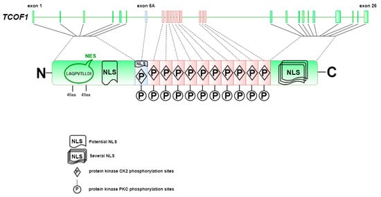 - Dixon, J.; Hovanes, K.; Shiang, R.; Dixon, M.J. Sequence analysis, identification of evolutionary conserved motifs and expression analysis of murine tcof1 provide further evidence for a potential function for the gene and its human homologue, TCOF1. Hum. Mol. Genet. 1997, 6, 727–737. [Google Scholar] [CrossRef]