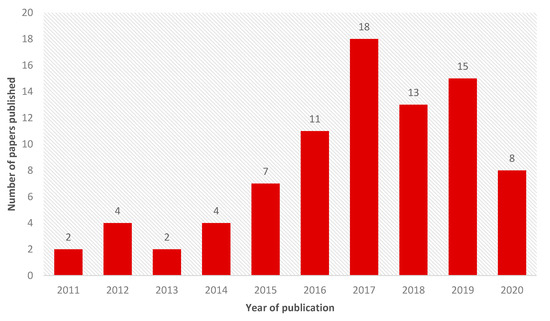The use of silver in dentistry dates from the 19th century and has different applications, mainly due to the antimicrobial potential of silver ions [1]. However, in the 21st century, the advent of nanotechnology brought a new perspective on the use of silver in dentistry through silver nanoparticles, which have antimicrobial action mainly due to the gradual release of silver ions [49,50,53,65]. The use of nanoparticles in dentistry over the years is evidenced by the number of articles published in the last ten years (Figure 2).