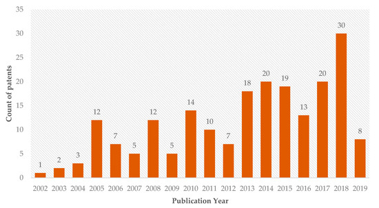 The search for patents that use silver nanoparticles in health applications resulted in 206 patents, with the first one applied in 2002, showing that this is a recent technology under constant development (Figure 3), which corroborates the literature that addresses the use of nanotechnology in health areas from the end of the 20th century [2].