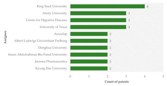 Patent analysis also shows that universities are the main depositors of this technology, becoming the cradle of nanotechnology research (Figure 5). Among the ten main assignees, seven are universities, demonstrating that this technology is practically being developed within educational institutions. In addition to universities, some companies are also depositors. Aesculap Inc., a multinational company located in the United States, working in the field of products and services for surgical procedures, and Janssen Pharmaceutical, located in Belgium, linked to Johnson & Johnson’s, which is dedicated to pharmacological research, are some examples of companies dedicated to this issue.