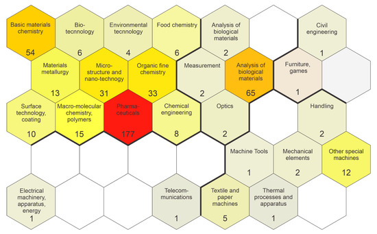 When analyzing the technological domains of patents, it was observed that most of them are related to the pharmaceutical domain, among other technological fields (Figure 6), mainly due to the antimicrobial activity of silver nanoparticles. In dentistry, the range of technological domains is even more evident since AgNPs are commonly associated with biomaterials, such as the invention of the silver-PMMA nanocomposite film based on Aristolochia bracteolate with inhibition activity on E. coli and Bacillus cereus growth in aqueous solutions [148].