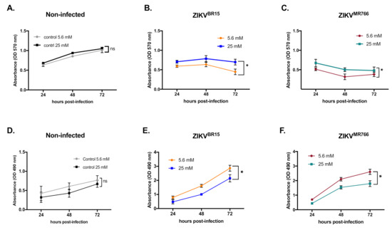 ZIKV-mediated cytopathic effects under high-glucose condition. The metabolic activity of non-infected HK-2 cells (A) or infected with ZIKVBR15 (B) and ZIKVMR766 (C) at MOI of 1 in low- and high-glucose conditions was determined at different time-points of infection using 3-[4,5-dimethylthiazol-2-yl]-2,5-diphenyltetrazolium bromide (MTT) assay. Analysis of Lactate Dehydrogenase (LDH) release was performed to evaluate the membrane integrity of uninfected (D), ZIKVBR15 (E), and ZIKVMR766 (F) -infected HK-2 cells. Data were obtained by measuring the absorbance at 570 nm and 490 nm for MTT and LDH assays respectively, with a background subtraction of the absorbance at 690 nm. Results are shown as means ± SEM of three independent experiments. Two-way ANOVA test demonstrates that differences are nonsignificant (ns) or statistically significant (* p < 0.05).