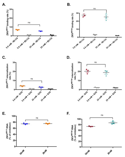 HK-2 cells grown in 12-well plates were pre-chilled at 4 °C for 30 min. Cells were incubated with ZIKV in DMEM containing 5.6 or 25 mM glucose at MOI of 1 at 4 °C for 1 h. The inoculum was then removed, and cells were washed with cold MEM supplemented with 2% FBS. Samples were then submitted to RT-qPCR. EGCG (100 µM) was used as a binding inhibitor.