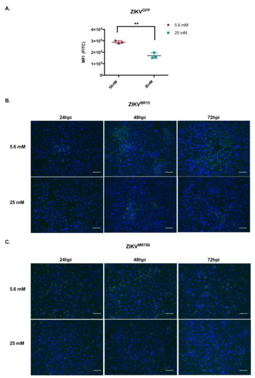 All the above-described data suggest that ZIKV restriction by high glucose concentration could take place in HK-2 cells at the viral replication level. To test this hypothesis, we took advantage of the MR766 based GFP-reporter ZIKV (ZIKVGFP), whose GFP expression, as part of the viral polyprotein, is a direct reporter of viral propensity to replicate [20]. HK-2 cells were infected at an MOI of 1 and green fluorescent protein (GFP) expression was analyzed by cytometry at 24 hpi, as GFP accumulation was cytotoxic at later time points (data not shown). The MFI of ZIKVGFP-infected HK-2 cells was significantly lower in the high-glucose condition (Figure 4A). To confirm these results, infected HK-2 cells were immunostained with J2 monoclonal antibody, which only recognizes double-stranded RNA, a key feature of RNA virus replication. Figure 4B (ZIKVBR15) and C (ZIKVMR766) show that immunosignal was lower in high glucose concentration. These results support that ZIKV infection of HK-2 cells is impaired by high glucose at the viral replication level.
