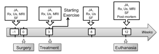 A schematic presentation of the timeline of the study. JA—Joint assessment; Rx—Radiographic examination; Us—Ultrasound examination; MRI—Magnetic resonance imaging; SF—Synovial fluid sampling and analysis; Post-mortem—Post-mortem analysis including macroscopic and microscopic examination of the joints after euthanasia.