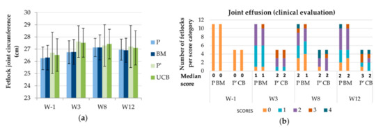 Evolution of two clinical parameters throughout the study period displayed per treatment group and per time point. (a) Mean (standard deviation) of the fetlock joint circumference. (b) Median scores and number of fetlocks per joint effusion score. W—Week; P—Fetlocks injected with placebo, contralateral of the fetlocks injected with bone-marrow derived mesenchymal stem cells (BM-MSCs); BM—Fetlocks injected with BM-MSCs; P’—Fetlocks injected with placebo, contralateral of the fetlocks injected with umbilical cord blood derived mesenchymal stem cells (UCB-MSCs); CB—Fetlocks injected with UCB-MSCs.