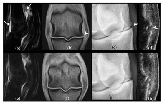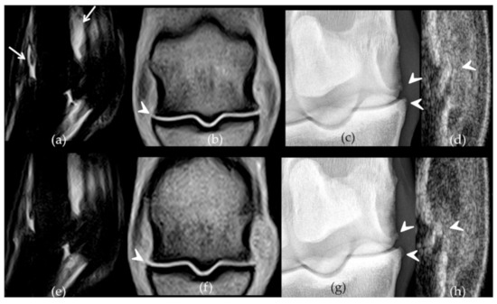 Comparative imaging findings observed on week 12 on the front metacarpophalangeal joints of horse 4. The left fore fetlock (a–d) received placebo treatment while the right fore fetlock (e–h) received umbilical cord blood derived mesenchymal stem cells (UCB-MSCs)on week 3. On the left fetlock there was grade 3 (white arrows) synovial effusion (a) and periarticular osteophytes (b) (arrow heads) on Short Tau Inversion Recovery sagittal magnetic resonance imaging (MRI) images (a) and T1-weighed dorsal MRI images (b) respectively, while grades 2 were observed on the right fetlock (e–f). There are grade 2 (arrow heads) osteophytes on the dorsomedial-palmarolateral 35° oblique radiographic views from both fore fetlocks (c,g) and on the dorso-lateral aspect of both joints on ultrasound (d,h) (arrow heads).