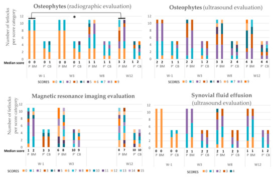 Evolution of the median scores and number of fetlocks per score category obtained for imaging parameters over the study period displayed per treatment group and per time point. W—Week; P—Fetlocks injected with placebo, contralateral of the fetlocks injected with bone-marrow derived mesenchymal stem cells (BM-MSCs); BM—Fetlocks injected with BM-MSCs; P’—Fetlocks injected with placebo, contralateral of the fetlocks injected with umbilical cord blood derived mesenchymal stem cells (UCB-MSCs); CB—Fetlocks injected with UCB-MSCs. * Significant difference between paired placebo and mesenchymal stem cell (MSC) treated fetlocks, considering the differences between W12 and W-1 values with p < 0.05.