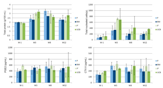 Evolution throughout the study period of the median values (1st quartile- 3rd quartile) of synovial fluid parameters displayed per treatment group. W—Week; P—Fetlocks injected with placebo, contralateral of the fetlocks injected with bone-marrow derived mesenchymal stem cells (BM-MSCs); BM—Fetlocks injected with BM-MSCs; P’—Fetlocks injected with placebo, contralateral of the fetlocks injected with umbilical cord blood derived mesenchymal stem cells (UCB-MSCs); UCB—Fetlocks injected with UCB-MSCs.