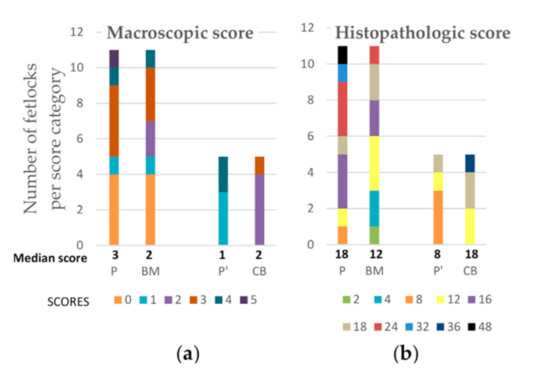 Median post-mortem scores and number of fetlocks per macroscopic (a) and histopathological (b) scores obtained on week 12 and displayed per treatment group. P—Fetlocks injected with placebo, contralateral of the fetlocks injected with bone-marrow derived mesenchymal stem cells (BM-MSCs); BM—Fetlocks injected with BM-MSCs; P’—Fetlocks injected with placebo, contralateral of the fetlocks injected with umbilical cord blood derived mesenchymal stem cells (UCB-MSCs); CB—Fetlocks injected with UCB-MSCs.