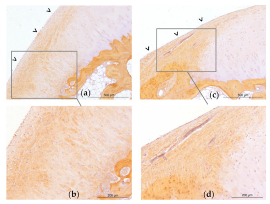 Representative light micrographs of osteochondral sections of the medial part of the distal aspect of the metacarpal condyles of horse 1. Micrographs obtained on Week 12, revealing type I collagen labelling (brown marking), and illustrating a grade 18 histological score on the left metacarpal condyle treated with umbilical cord blood derived mesenchymal stem cells (UCB-MSCs) (a–b) and on the right metacarpal condyle treated with placebo (c–d). On the UCB-MSC treated joint, there is mild erosion of the superficial layer of the articular cartilage (a). On both joints, there is a large fibrocellular tissue (open arrow heads) that is partly positive for type I collagen, and under which the tidemark is no longer present. The chondrocytes of the deep layers are also marked with type I collagen. The subchondral bone appears trabecular.