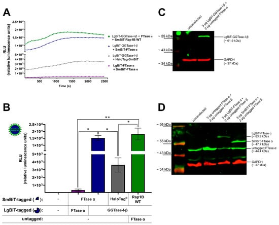 The co-transfected combination of LgBiT-GGTase-I-β-subunit (50 ng/well) and SmBiT-FTase α-subunit (50 ng/well), as well as the co-transfected combination of LgBiT-GGTase-I-β-subunit (50 ng/well), untagged FTase α-subunit (100 ng/well), and SmBiT-Rap1B WT (50 ng/well) were able to generate a robust luminescence signal, which was stable over a time frame of 42 min (Figure 1A). The untagged FTase α-subunit was co-transfected to form the heteromeric and functional GGTase-I. A slightly diminished luminescence signal was observed for the interaction of LgBiT-GGTase-I-β-subunit/FTase α-subunit/SmBiT-Rap1B WT compared to the LgBiT-GGTase-I-β/SmBiT-FTase-α-subunit heteromer (Figure 1A). Furthermore, co-transfection of LgBiT-GGTase-I-β-subunit (50 ng/well) with a non-interacting protein, HaloTag®-SmBiT (50 ng/well), did only yield a slight increase in luminescence. The signal was approximately 5-fold and significantly lower than the heteromeric positive control LgBiT-GGTase-I β-subunit/SmBiT-FTase α-subunit and the interaction between LgBiT-GGTase-I-β-subunit/FTase α-subunit/SmBiT-Rap1B WT (* p < 0.05) (Figure 1B). Moreover, co-transfection of SmBiT-FTase α-subunit (50 ng/well) and LgBiT-FTase α-subunit (50 ng/well) showed an approximately 50-fold lower luminescence signal compared to the heteromeric positive control LgBiT-GGTase-I β-subunit/SmBiT-FTase α-subunit (* p < 0.05) and the interaction between LgBiT-GGTase-I-β-subunit/FTase α-subunit/SmBiT-Rap1B WT (** p < 0.01) (Figure 1B). The expression of LgBiT-GGTase-I-β-subunit (~61.9 kDa) (Figure 1C), untagged FTase α-subunit (~44.4 kDa), LgBiT-FTase α-subunit (~63.9 kDa), and SmBiT-FTase α-subunit (~47.7 kDa) was confirmed by Western blots (Figure 1D). As the blots show, untransfected HEK293 cells expressed untagged FTase α, which represents the α-subunit of GGTase-I, endogenously (Figure 1D). The respective band intensified upon overexpression of untagged FTase α and remained in cells transfected with LgBiT-FTase α and SmBiT-FTase α (Figure 1D).