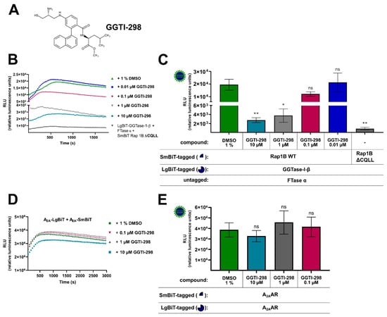 Effect of the cell-permeable, competitive CAAX (defined by a cysteine residue, two aliphatic residues, and the C-terminal residue) peptidomimetic GGTase-I inhibitor GGTI-298 on the interaction of GGTase-I and Rap1B and on A2AAR-homodimers. HEK293 cells stably expressing the adenosine A2B receptor (A2BAR) were transiently co-transfected as described in Figure 1. From the Rap1B mutant, ΔCQLL 50 ng DNA/well was used. Additionally, for a control of the specificity of GGTI-298, HEK293 cells were transiently transfected with combinations of plasmids encoding LgBiT and SmBiT attached to the C-terminus of the human A2AAR (each 100 ng DNA/well). (A) Structure of the cell-permeable, competitive CAAX peptidomimetic GGTase-I inhibitor GGTI-298. (B) Twenty-four hours after transfection, the cells were pre-treated for 30 min with the selective GGTase-I inhibitor GGTI-298 in different concentrations (10 µM, 1 µM, 0.1 µM, 0.01 µM) or with 1% DMSO at 37 °C in OptiMEM medium. Then the NanoGlo live-cell substrate was added and the association was immediately monitored at 25 °C over a time period of 30 min with a luminescence reading taken every 30 s. (C) After a time period of ~ 400–700 s the maxima of complex formation were reached (dependent on which GTI-298 concentration was used, see (B), and the relative luminescence units (RLU) were plotted. Significant differences were observed between the untreated LgBiT-GGTase-I-β/FTase α/SmBiT-Rap1B WT complex and the GGTI-298 inhibitor (10 µM, 1 µM) treated Lg-BiT-GGTase-I-β/FTase α/SmBiT-Rap1B complex (* p < 0.05, ** p < 0.01). (D) After 24 h the A2AAR transfected HEK293 cells were pre-treated for 30 min with the selective GGTase-I inhibitor GGTI-298 in different concentrations (10 µM, 1 µM, 0.1 µM) or with 1% DMSO at 37 °C in OptiMEM medium. Then the NanoGlo live-cell substrate was added, and the association was immediately monitored at 25 °C over a time period of 50 min, with a luminescence reading taken every 30 s. (E) After a time period of ~ 1005 s, the maxima of A2AAR-homodimer formation were reached, and the relative luminescence units (RLU) were plotted. No significant differences were observed between the untreated A2A-LgBiT/A2A-SmBiT homodimer and the GGTI-298 inhibitor (10 µM, 1 µM, 0.1 µM) treated A2A-LgBiT/A2A-SmBiT homodimer (ns, not significant).