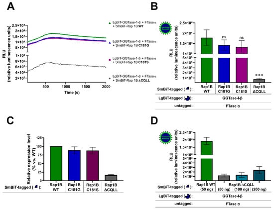 Having established that the new NanoBiT assay is suitable to measure the interaction of human GGTase-I and Rap1B, we were interested in studying the interaction of human GGTase-I with prenylation-deficient Rap1B mutants. Rap1B contains a C-terminal hypervariable region, which consists of a polybasic region (PBR) and the CAAX motif. The CAAX motif contains the cysteine that is the site of prenylation and is important for the coordination of the Zn2+ ion in the active site of the enzyme []. Crystal structures are known of several complexes formed by the rat GGTase-I and different substrates [,], but no models or crystal structures are published for human GGTase-I and Rap1B complexes. We therefore further evaluated the effect of prenylation-deficient Rap1B mutants on the direct binding of human GGTase-I, which has not yet been characterized. For that, the cysteine in the CAAX motif was replaced by serine or glycine to generate the non-prenylateable Rap1B mutants C181S and C181G. Moreover, a complete CAAX motif deletion mutant, ΔCQLL, was generated.